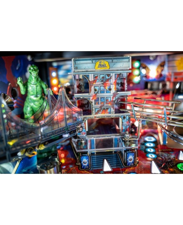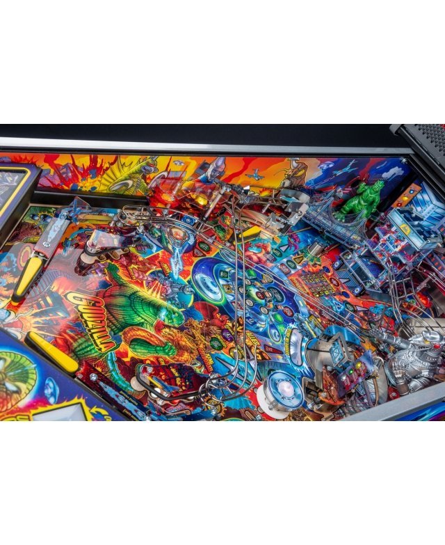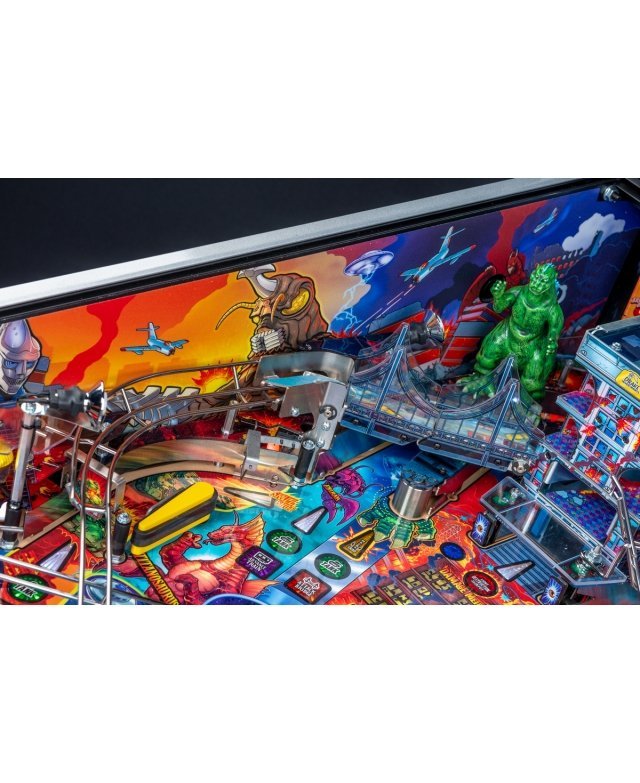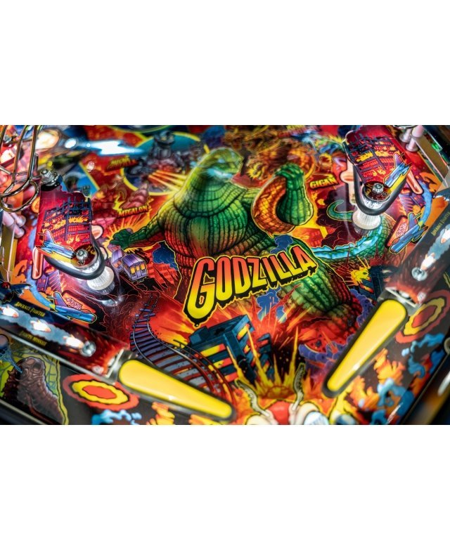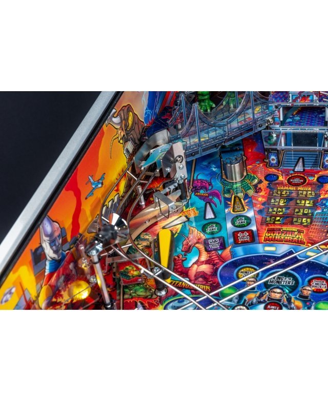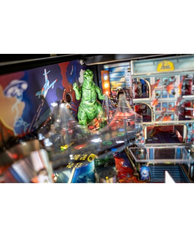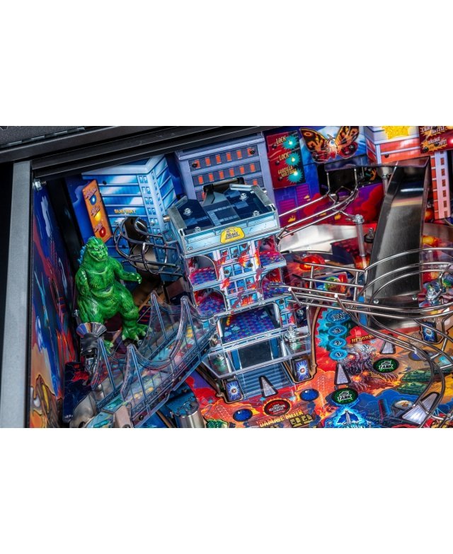 Le chaos et la destruction sont au rendez-vous sur le plateau de jeu avec le Godzilla multiball, que l’on démarre en tirant l’un des différents coups dans et à travers le gratte-ciel situé au centre. Dans les modèles Premium et LE, un moteur actionne le gratte-ciel, déviant les balles à travers chacun de ses cinq étages pendant qu’il s’effondre, pour finalement bloquer trois balles sur son toit. Le terrain de jeu Premium/LE comporte également une passerelle qui s’effondre. Cette rampe animée est gardée par un Godzilla moulé sur mesure et peut détourner les boules vers le flipper ou directement sur le terrain de jeu pendant le multi-ball Bridge Attack.