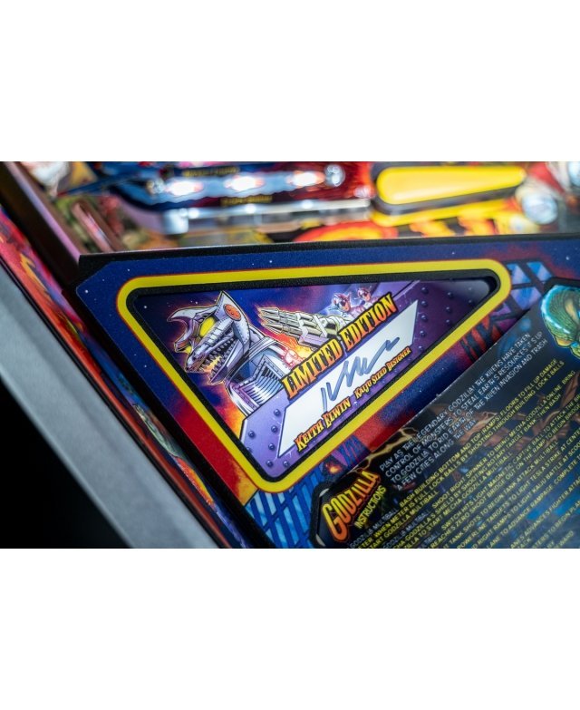 Cette version LE comprend une vitre de fronton exclusive en miroir pleine couleur inspirée de Mechagodzilla, des illustrations de caisse personnalisées et emblématiques, une armature de flipper en peinture en poudre métallisée argentée et brillante, une plaque inférieure autographiée par un designer, des bandes artistiques intérieures exclusives, un système audio amélioré, une vitre anti-reflet pour le flipper, un moteur de secouage, une plaque numérotée séquentiellement et un certificat d’authenticité.
